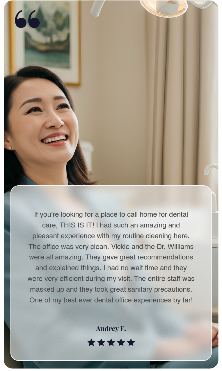 “If you’re looking for a place to call home for dental care, THIS IS IT! I had such an amazing and pleasant experience with my routine cleaning here. The office was very clean. Vickie and the Dr. Williams were all amazing. They gave great recommendations and explained things. I had no wait time and they were very efficient during my visit. The entire staff was masked up and they took great sanitary precautions. One of my best ever dental office experiences by far!”